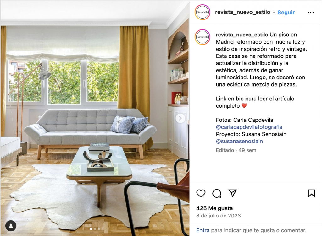 La revista Nuevo Estilo, le dedica un reportaje al proyecto E&F. Se puede acceder a través de Instagram y en él se destaca la reforma realizada, de inspiración retro y vintage, para actualizar la distribución y la estética de la vivienda, además de ganar en luminosidad.